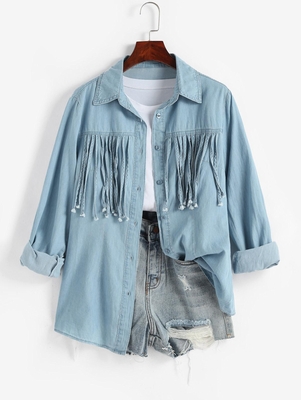 Zaful Style: Fashion Occasion: Daily Collar: Shirt Collar Fit Type: Regular Shirt Length: Regular Material: Cotton, Polyester Material Stretch: No Stretch Sleeves Length: Long Sleeves Pattern Type: Solid Color Decoration: Fringed Seasons: Fall Weight: 0.2600kg Package: 1 x Shirt