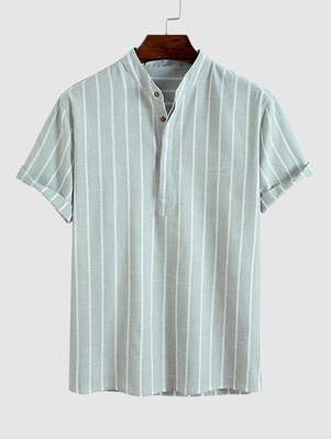 Zaful Shirts Type: Casual Shirts Style: Fashion Occasions: Daily, Office Fit Type: Regular Fit Shirt Length: Regular Sleeves Length: Short Collar: Stand Collar Material: Cotton, Polyester Material Stretch: No Stretch Pattern: Striped Decoration: Button Season: Summer Weight: 0.2000kg Package: 1 x Shi