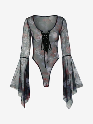 Material: Polyester, Spandex Collar-line: Scoop Collar Sleeves Length: Long Sleeves Sleeve Type: Flare Sleeve Chest Pad: None Pads Pattern Type: Rose, Skulls Decoration: Lace up, Mesh, Sheer Material Stretch: High Stretch Season: Fall With Belt: No Weight: 0.1100kg