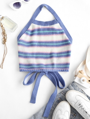 Zaful Whipped up from a knitted yarn, this piece is defined by the all-over colorful stripes & topped with a halter collar & fitted with an open-back for a subtle appeal. Style: Sexy Shirt Length: Crop Top Collar: Halter Collar