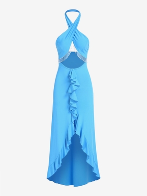 Halter Cut Out Ruffle Beads Tassel Maxi Dress S Blue
