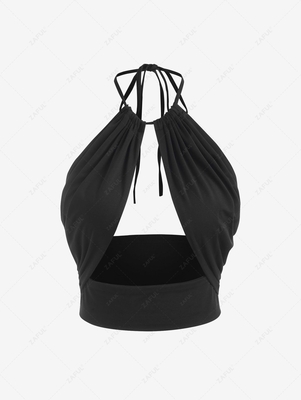 Zaful Topped with a halter collarline, this sleeveless top is designed with daring cut-out panels and ruched detail. Ideal for slipping on with some straight-leg trousers, we reckon. Style: Sexy Shirt Length: Crop Top Collar: Halter Collar Material: Polyester, Spandex Pattern Type: Solid Decoration: