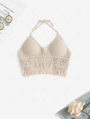 Zaful Bring some crochet coziness to your summertime wardrobe with this charming cropped top, a halter-collar silhouette in an easy-breathing crochet-knit that's accented with a touch of fringe trims. Style: Cute Shirt Length: Crop Top Collar: Halter Collar