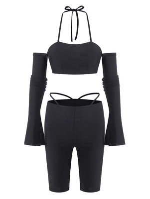Zaful Meet your ever-edgy look in this curve-shapely matching set simply featuring an extreme crop top with flare sleeves and a supportive halter collar and a pair of flattering biker shorts fashioned with slinky straps to accent the high waist. Occasion: Daily Style: Fashion Fit Type: Skinny Colla