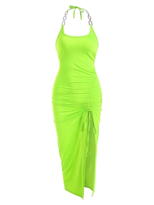 Zaful Whipped up in a stretchy jersey fabric, it's characterized by its halter collarline with heavy hardware panels, open back, a thigh split, & all-over ruching. Style: Sexy Occasion: Club, Cocktail & Party, Date Night, Going Out, Night Out Silhouette: Bodycon Collar-line: Halter Sleeves Length: Sl