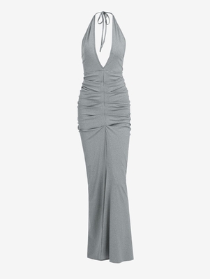 Halter Plunge Front Ruched Backless Maxi Dress L Gray