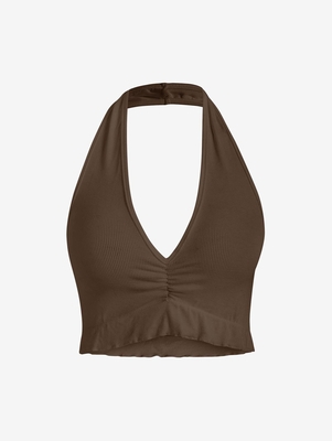 Halter Ribbed Frilled Crop Top M Deep Coffee