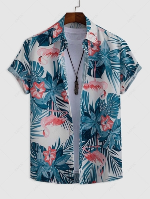 Zaful Shirts Type: Casual Shirts Style: Hawaiian Occasions: Beach, Holiday, Vacation Fit Type: Regular Fit Shirt Length: Regular Sleeves Length: Short Collar: Shirt Collar Material: Polyester, Spandex Material Stretch: No Stretch Pattern: Flamingo, Leaves, Tropical Print Placement Print: No Season: Summ