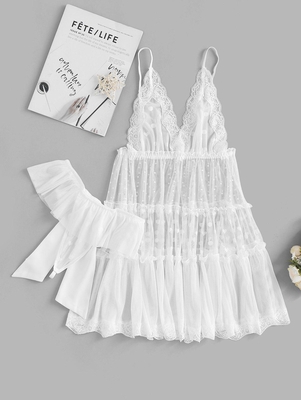 Material: Elastane, Polyester Collar-line: Spaghetti Straps Sleeves Length: Sleeveless Pattern Type: Solid Decoration: Lace Material Stretch: Slight Stretch Weight: 0.1600kg Package: 1 x Dress 1 x Panty