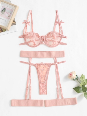 Heart Embroidered Bowknot Lace Grater Lingerie Set With Leg Rings L