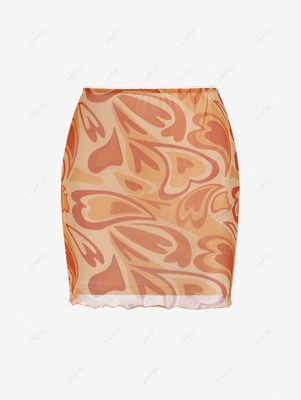 Heart Print Mesh Overlay Picot Trim Bodycon Skirt Xl Orange