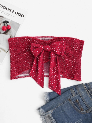 Zaful This strapless top was made for days by the beach or to celebrate the anniversary of Valentine's day with an allover hearts print, shapely smocked fabric for a unique touch, & a pretty bowknot for added romance. Style: Sexy Shirt Length: Crop Top Collar: Strapless