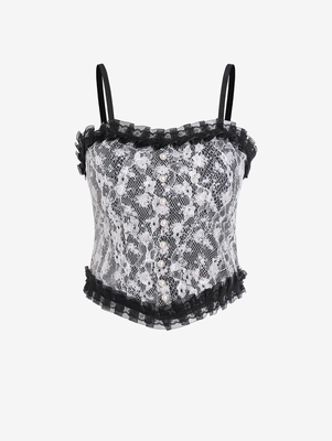 Lace Decor Faux Pearl Chest Pad Crop Top Black