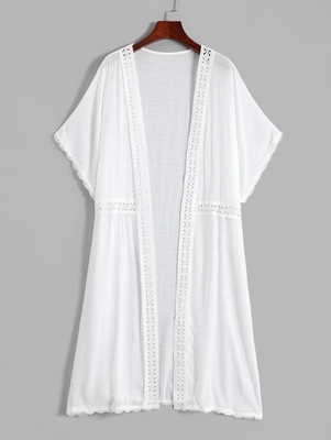 Zaful Cover-Up Type: Kimono Gender: For Women Length: Long Collar-line: Collarless Sleeves Length: 1/2 Sleeves Material: Polyester, Viscose Pattern Type: Solid Decoration: Lace Material Stretch: No Stretch Weight: 0.1750kg Package: 1 x Cover Up