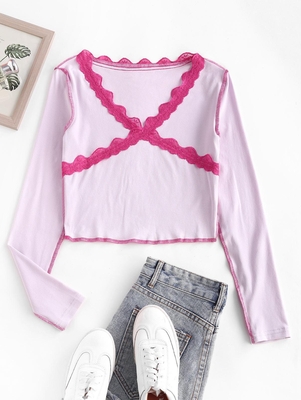 Lace Panel Topstitching Long Sleeve Baby Tee S Light Pink