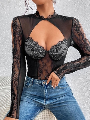 Material: Elastane, Polyester Material Stretch: High Stretch Pattern Type: Solid Color Decoration: Lace, See Through Seasons: Fall Weight: 0.0950kg Package: 1 x Top