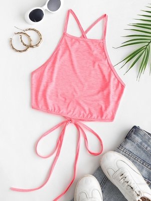 Zaful Adorned with a space-dye pattern, this crop top features thin criss-cross straps cascade into a seductive & adjustable lace-up back for a visually striking finish. Style: Sexy Shirt Length: Crop Top Collar: Spaghetti Strap