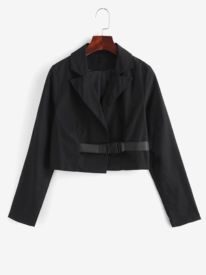Zaful A buckle belt helps to slim the waist in this boxy, cropped blazer jacket with a notched lapel in black solid hues that makes it perfect to versatile your office looks. Occasions: Daily Style: Fashion Clothes Type: Jackets