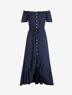 Off Shoulder Button Front Ruffles Midi Dress L Deep Blue