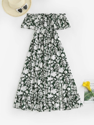 Zaful Style: Casual Occasion: Vacation Silhouette: A-Line Collar-line: Off The Shoulder Sleeves Length: Short Sleeves Dresses Length: Midi Material: Polyester Material Stretch: No Stretch Pattern Type: Floral Decoration: Slit Season: Fall, Spring, Summer With Belt: No Weight: 0.2890kg Package: 1 x Dr