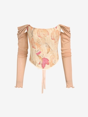 Off Shoulder Leaf Pattern Lace Up Corset Style Top S Light Coffee