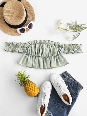 Off Shoulder Ruffle Crop Blouse S Light Green
