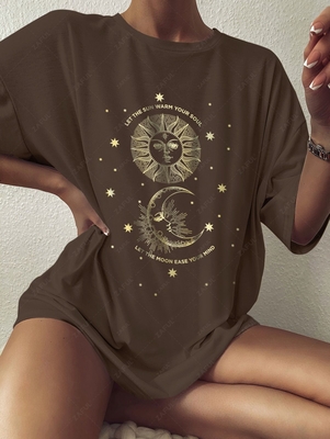 Zaful A fun sun, star, & moon graphic at the front details this soft, all-cotton tee in a slouchy, oversized cut. Pair it with easy cutoffs or biker shorts for a cool weekend-ready look. Style: Boyfriend, Cute Occasions: Daily Shirt Length: Long Collar: Round Collar Sleeve Type: Drop Shoulder Slee