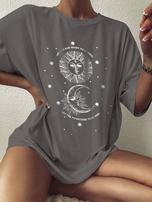 Zaful A fun sun, star, & moon graphic at the front details this soft, all-cotton tee in a slouchy, oversized cut. Pair it with easy cutoffs or biker shorts for a cool weekend-ready look. Style: Boyfriend, Cute Occasions: Daily Shirt Length: Long Collar: Round Collar Sleeve Type: Drop Shoulder Slee