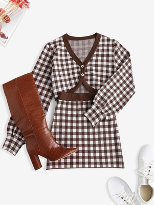 Zaful Add a little bit of modern chic to elevate your preppy-style look in this allover plaid set designed with a cropped knit cardigan with two buttons for easy closure & a matching monotextured skirt to complete the sassy varsity-style look. Style: Fashion, Preppy Occasion: Daily Fit Type: Regul