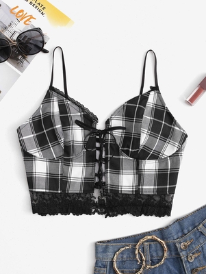 Zaful Plaid but not plain, whether you style it sexy or sweet, this cropped cami exposes timeless charms and is fashioned with front lace-up straps and back hook-and-eye details to help adjust the fit. Lace trims and the embroidered floral at the hems add plenty of glams. Style: Sexy Shirt Length: