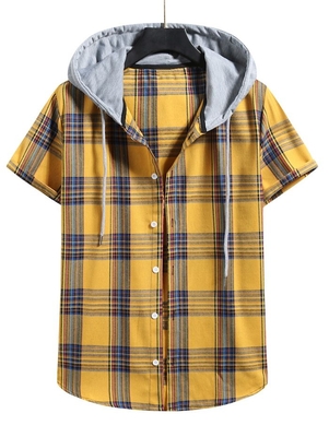 Zaful The slim-fit plaid shirt is perfect for casual outfits. It is featuring a color-block drawstring attached hood, frontal button closure, & short sleeves. Pair the piece with most collections to take on a laid-back weekend & vacation. Shirts Type: Casual Shirts Occasions: Casual, Vacation Fi