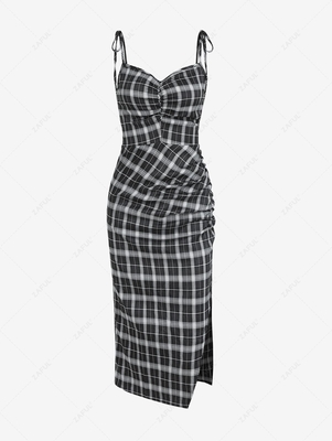 Zaful Style: Cute Occasion: Daily Silhouette: Sheath Collar-line: Spaghetti Strap Sleeves Length: Sleeveless Dresses Length: Midi Material: Elastane, Polyester Material Stretch: No Stretch Pattern Type: Plaid Decoration: Adjustable Shoulder Strap, Ruched, Slit Season: Fall, Summer With Belt: No Weight:
