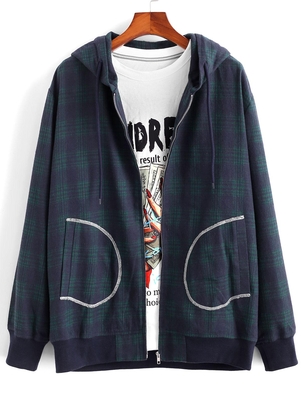 Plaid Stitching Pocket Hooded Zip Jacket M Deep Blue