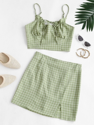 Plaid Ties Smocked Back Slit Skirt Set Xl Green