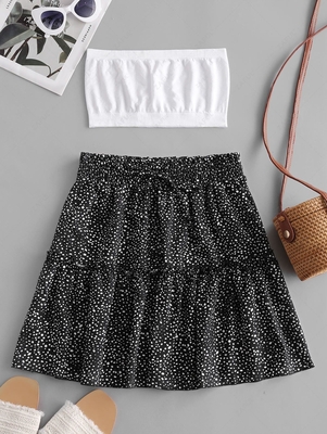 Zaful A solid-color bandeau top & the dalmatian dot skirt combine to bring a flattering mix-&-match look that you will love at first sight. This two-piece set is a perfect outfit for weekends or some special events. Occasion: Daily Style: Fashion Fit Type: A Line Collar-line: Strapless Sleeves
