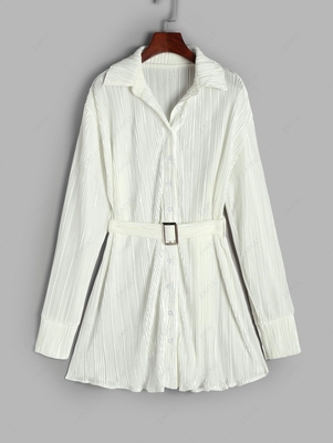 Plisse Belted Drop Shoulder Shirt Dress L White