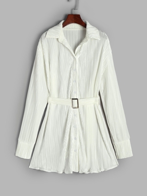 Plisse Belted Drop Shoulder Shirt Dress M White