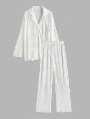 Plisse Pleated Button Up Shirt And Pants Set S White
