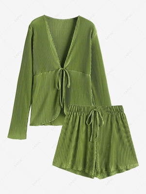 Plisse Pleated Tied High Waisted Shorts Set L Green