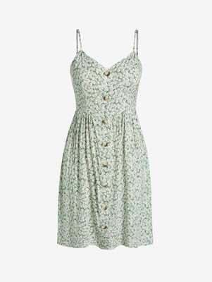 Zaful Available in a balmy ditsy floral print, this midi dress is topped with adjustable spaghetti straps & button-down fastening. We'll be slipping ours on with a pair of platform sandals & colorful hoop earrings, how about you? Style: Cottagecore Occasion: Vacation Silhouette: A-Line Collar-l