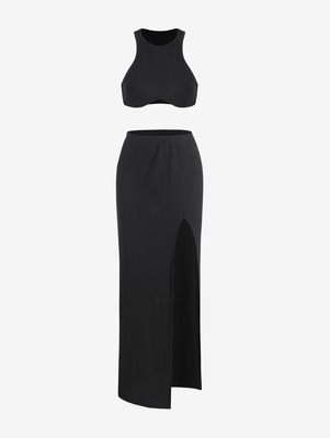 Material: Polyester, Spandex Material Stretch: High Stretch Waist Type: High Closure Type: Elastic Waist Pattern Type: Solid Decoration: Racerback, Slit Season: Sum