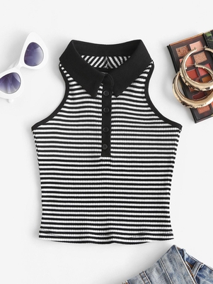 Zaful Buttoning up to the soft collar, this striped piece is knitted from a cozy cotton blended and topped with a haltercollar that echoes the open back. Style: Vintage Shirt Length: Crop Top Collar: Halter Collar Material: Cotton, Polyester Material Stretch: High Stretch Thickness: Standard Pattern