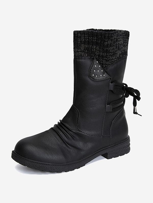 Retro Knitted Spliced Design Back Lace-up Fleece-lined Calf Boots