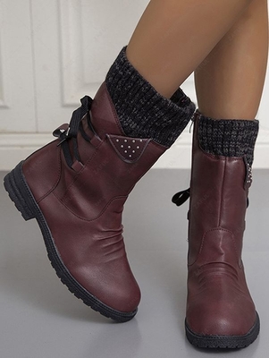 Retro Knitted Spliced Design Back Lace-up Fleece-lined Calf Boots