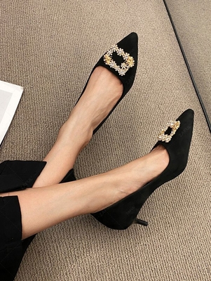 Material: Suede Pattern Type: Solid Color Decoration: Metal, Rhinestone Season: Fall, Spring, Summer, Winter Weight: 1.3398kg Package: 1 x Pumps