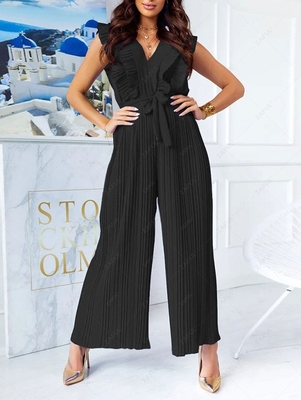 Zaful Style: Elegant Occasion: Daily Fit Type: Regular Collar-line: V-Collar Sleeves Length: Sleeveless Types: Wide Leg Jumpsuit Material: Polyester, Spandex Pattern Type: Solid Color Decoration: Pleated, Plisse, Ruffles With Belt: Yes Material Stretch: No Stretch Season: Fall, Spring, Summer Weight: 0.