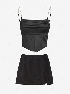 Zaful Occasion: Daily, Date Night, Night Out Style: Cute Fit Type: Regular Collar-line: Spaghetti Straps Sleeves Length: Sleeveless Silhouette: A Line Bottom type: Split Skirt Bottom Length: Mini Waist Type: High Closure Type: Zipper Fly