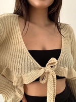 Zaful A statement ruffled knit instantly distinguishes this cropped cardigan, which closes with an adjustable tie in front & pairs perfectly with the knitted skirt & faded cutoffs. Type: Cardigans Occasions: Daily Style: Cute Fit Type: Slim Length: Crop Top Collar: Collarless Sleeves Length: Fu