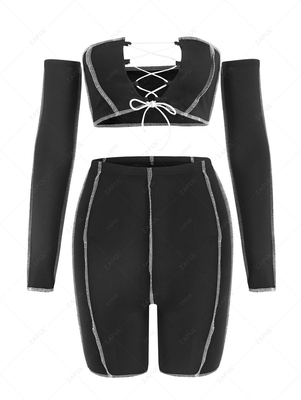 Zaful Stand out from the crowd in this two-piece set. It comprises a bandeau top with detachable long sleeves and lace-up straps fastening at the front plus matching biker shorts, which both feature contrast stitching for a contemporary color palette. Occasion: Daily Style: Sexy Fit Type: Skinny Co