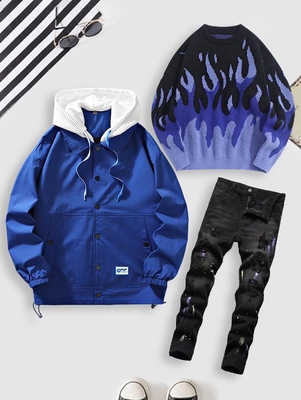 Zaful Type: 3 PCS Set Style: Casual, Fashion, Preppy Style, Streetwear Occasions: Daily, School Closure Type: Zipper Fly Pattern Type: Colorblock, Fireworks, Flame, Paint Splatter Decoration: Pocket, Ripped, Spliced